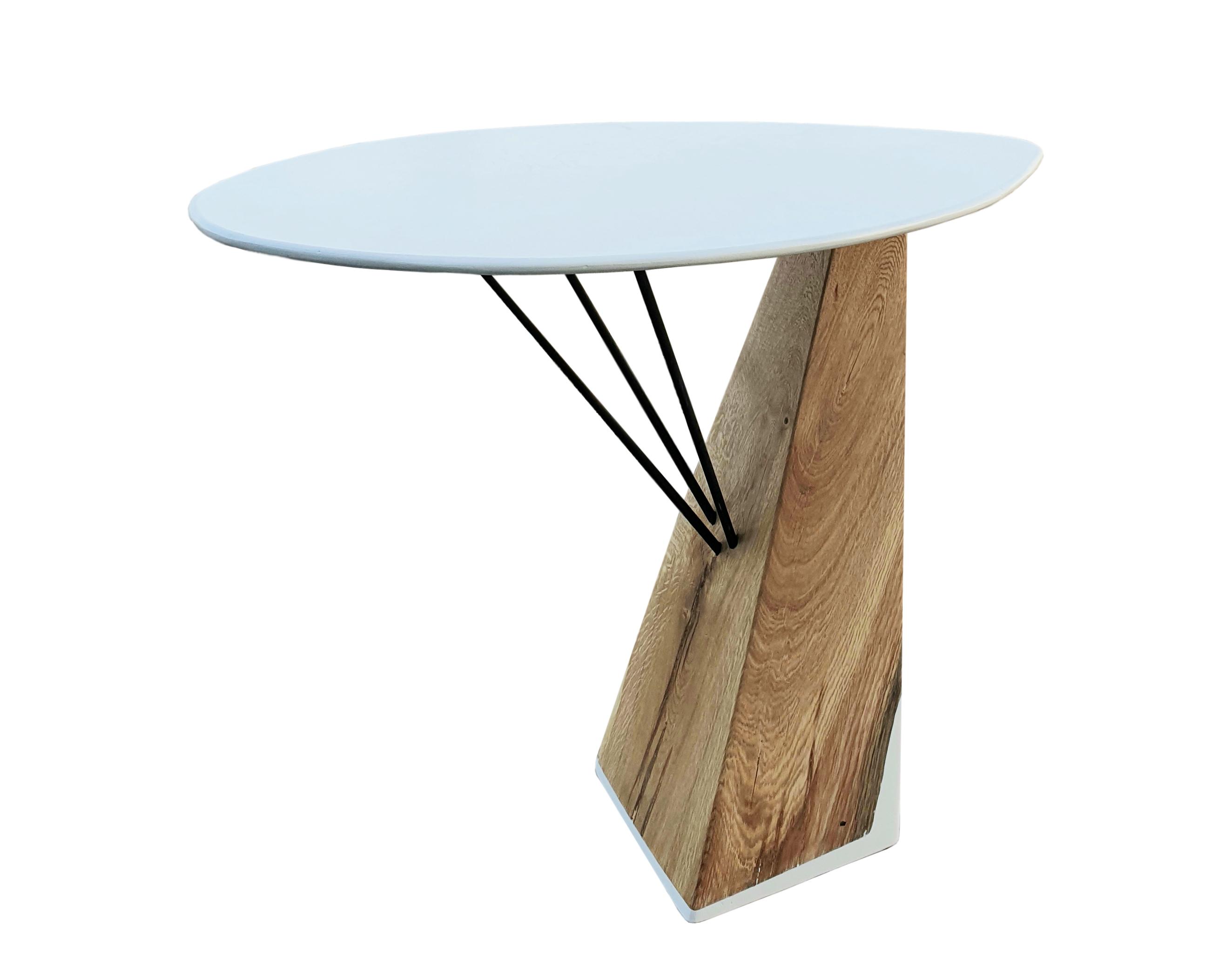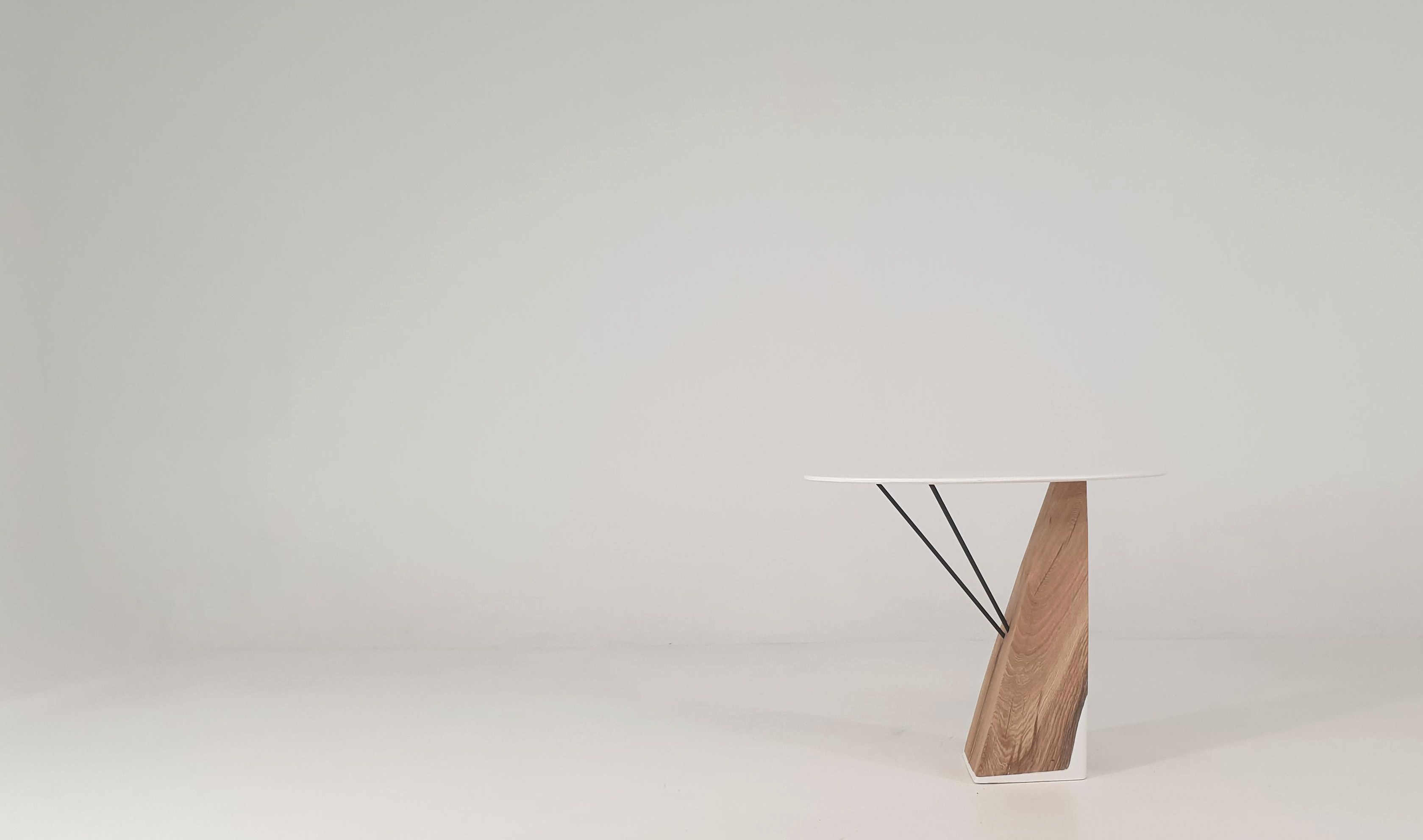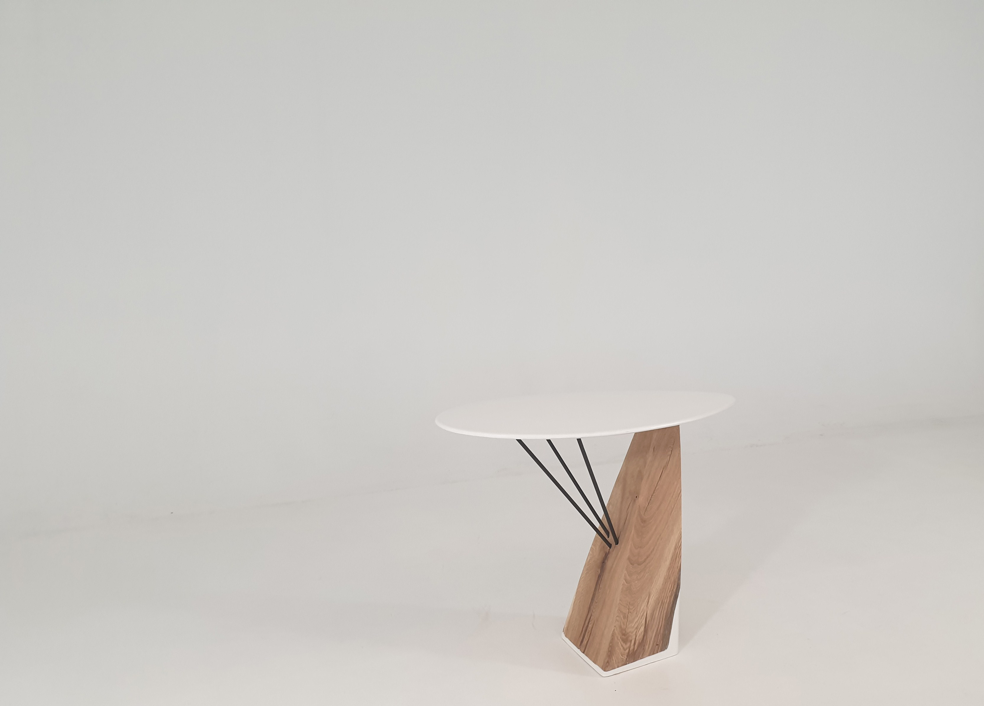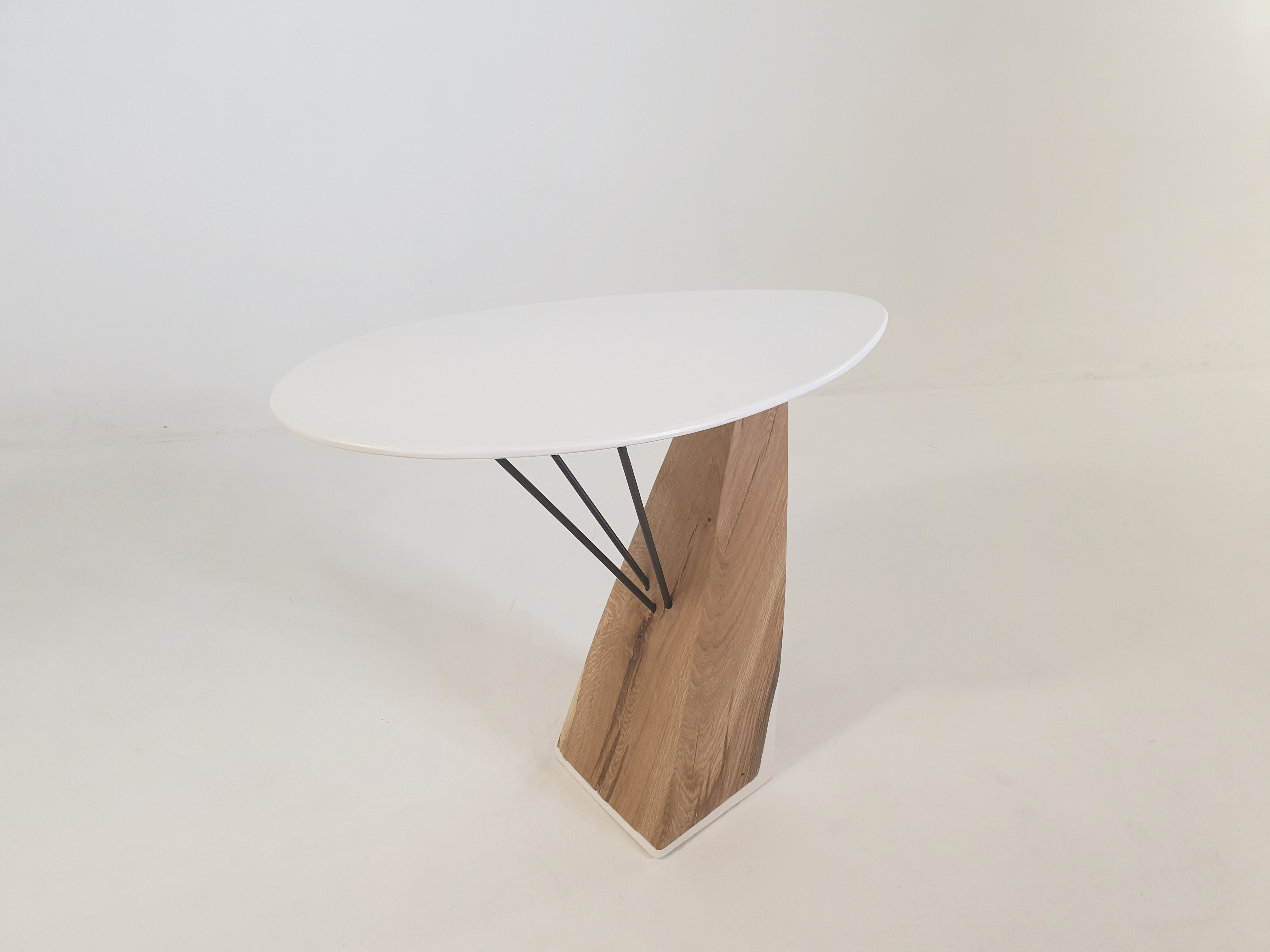 To improve the table’s stability, I reinforced the base with white concrete and connected the light top with steel rods. Finally, I oiled the trunk to enhance its colors, and painted the top with water-based white paint.