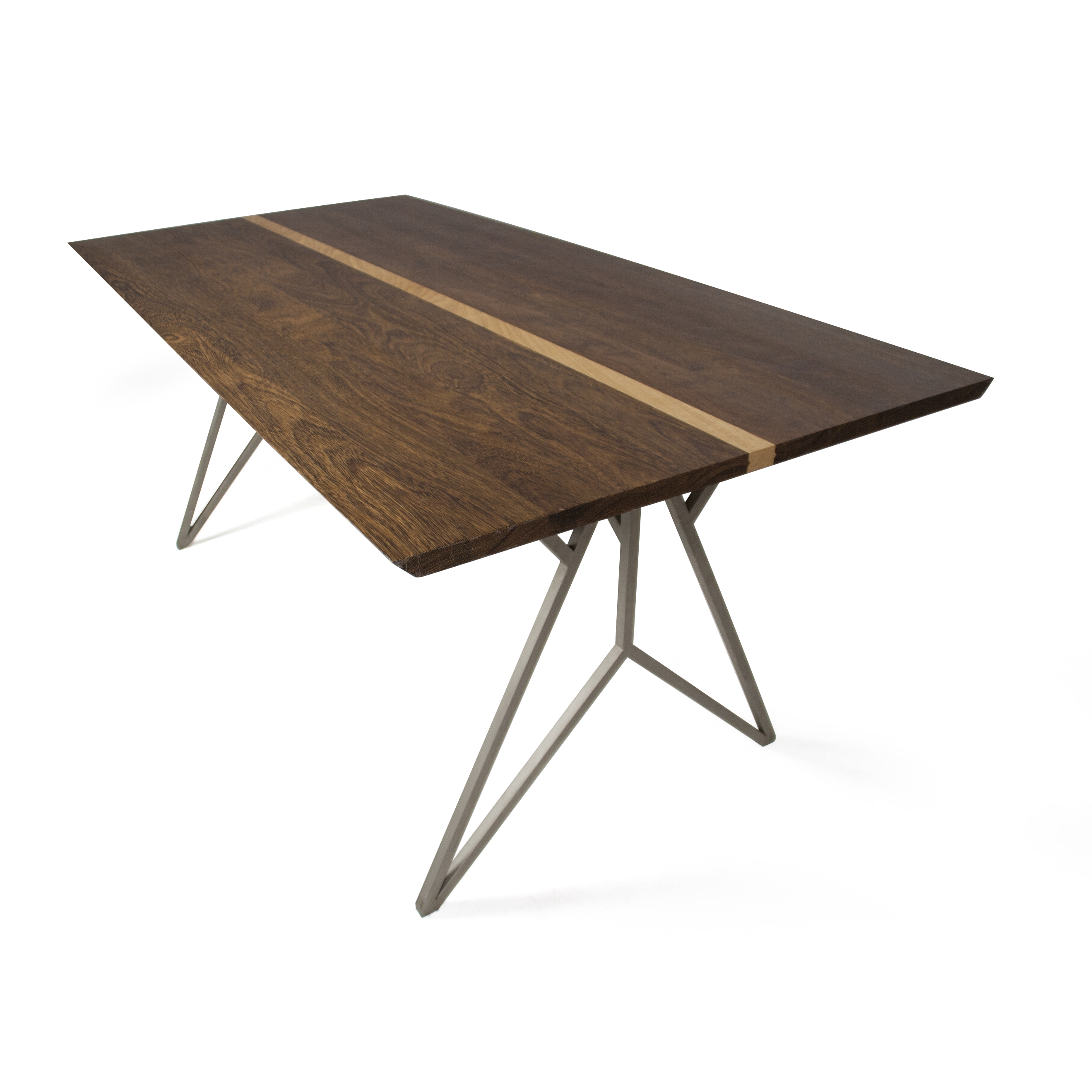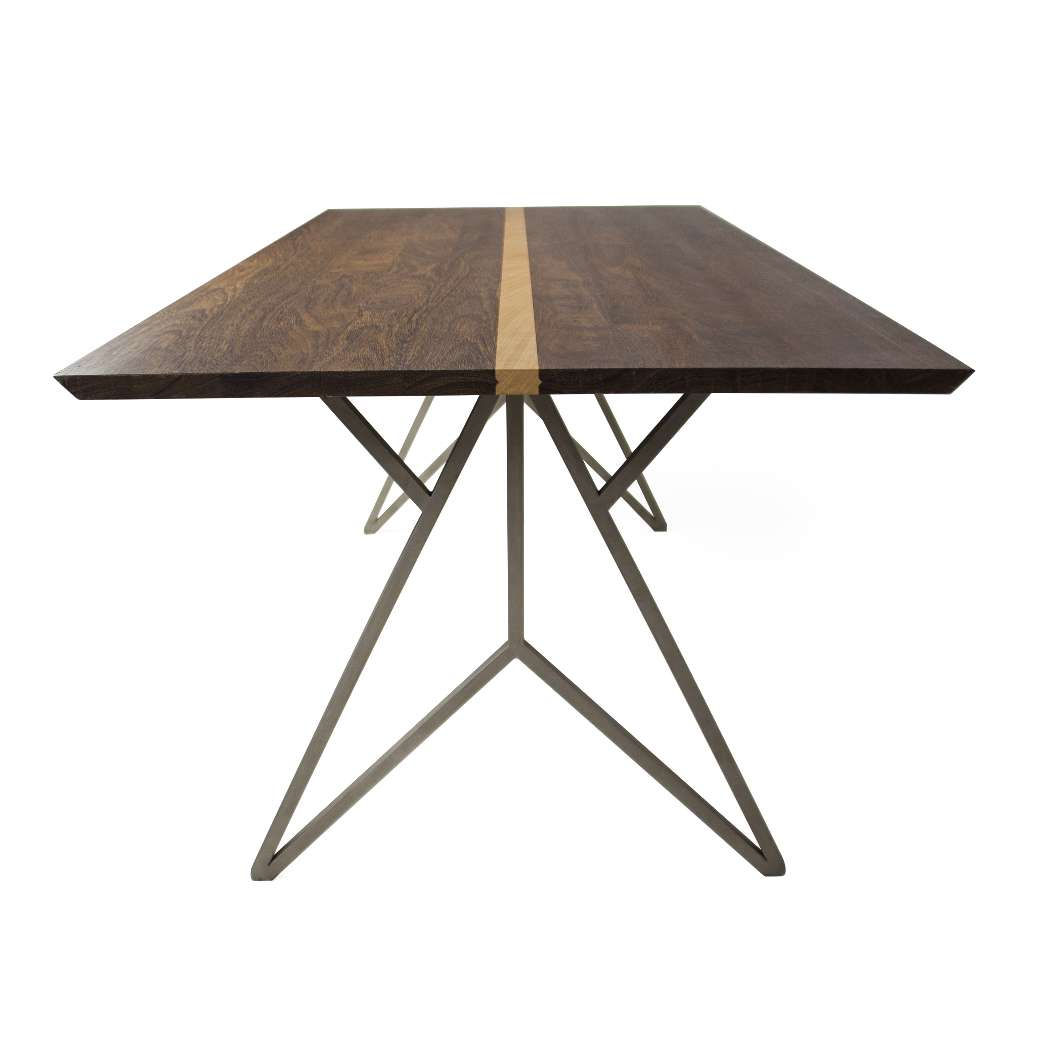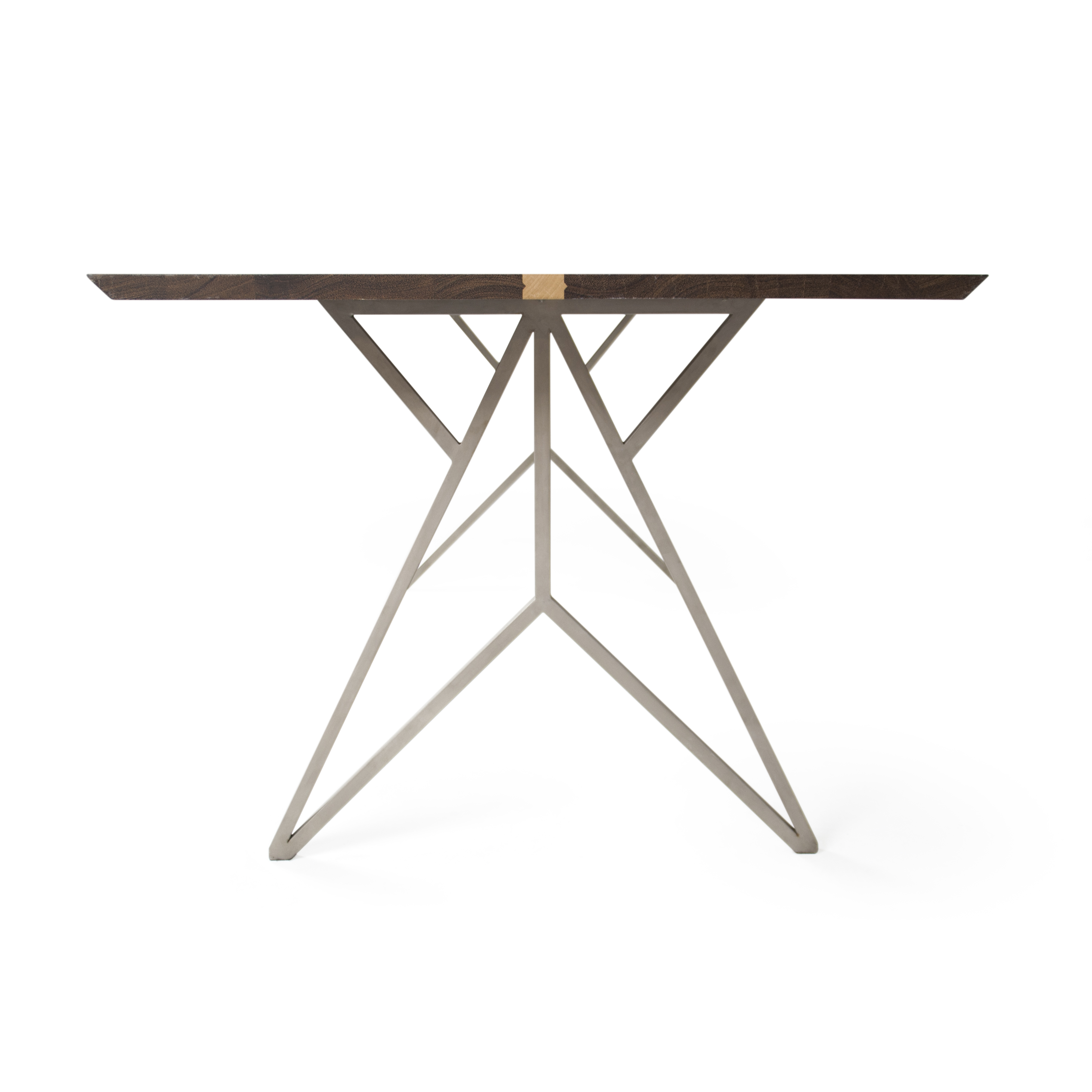 This table, designed to serve as either a desk or a dining surface, combines steel legs with a solid wood top. Its design draws inspiration from art, sculpture, and geometric balance. A reflection of strength meeting harmony.